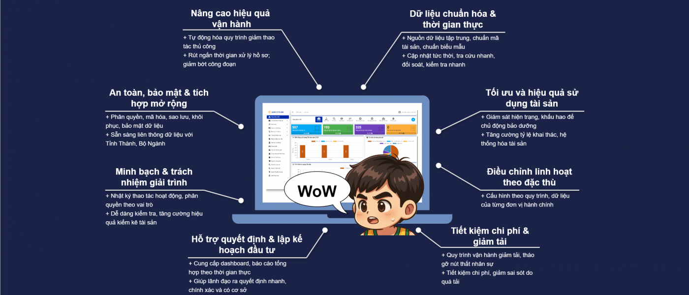 - Số hóa quy trình kiểm kê, phân loại, ghi sổ tài sản và báo cáo tài sản.